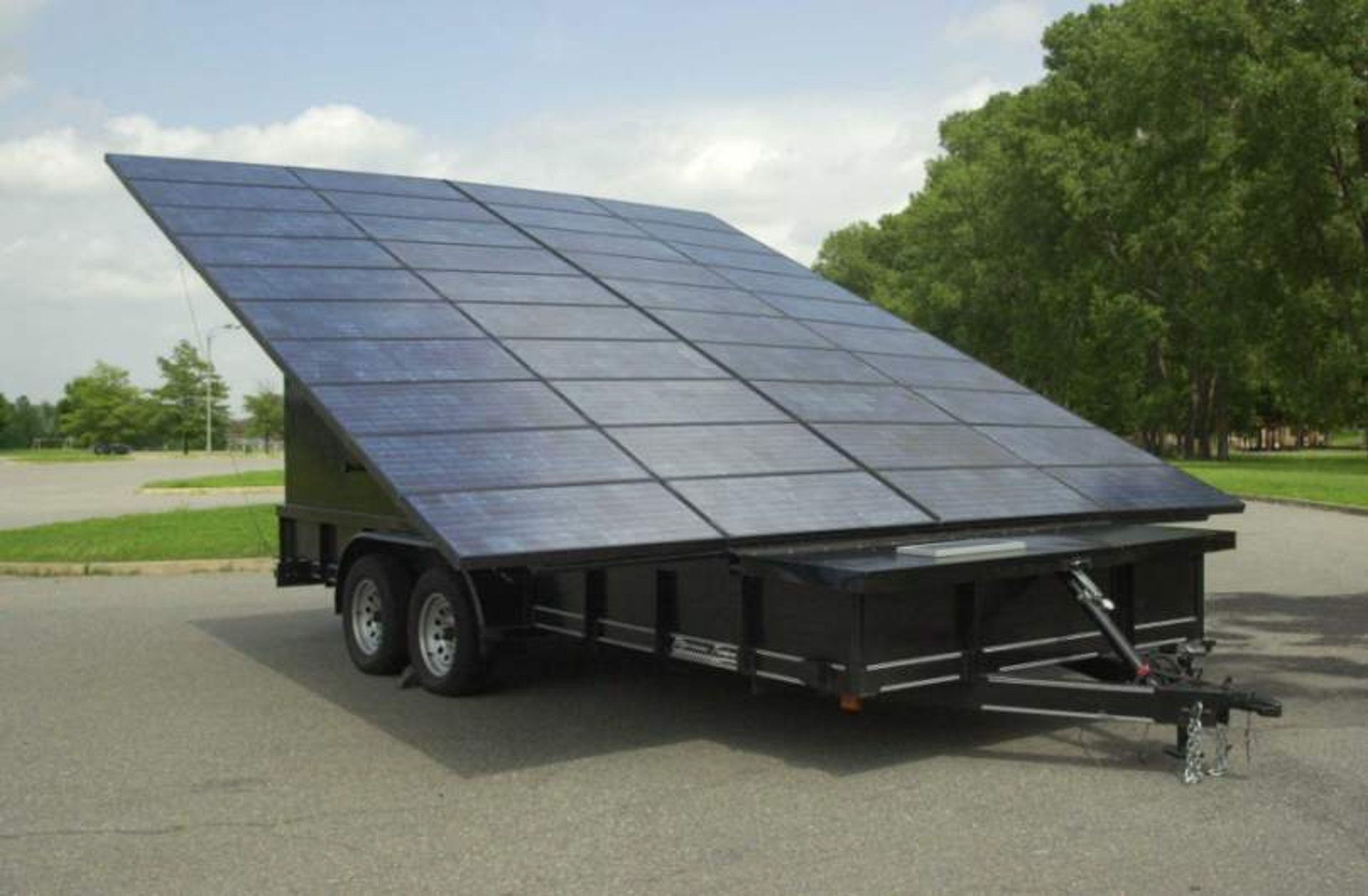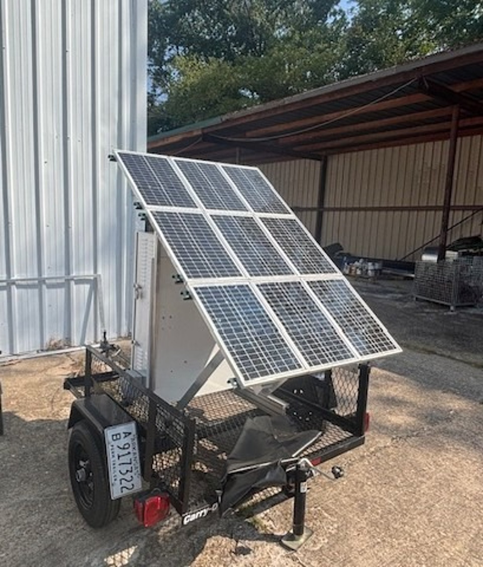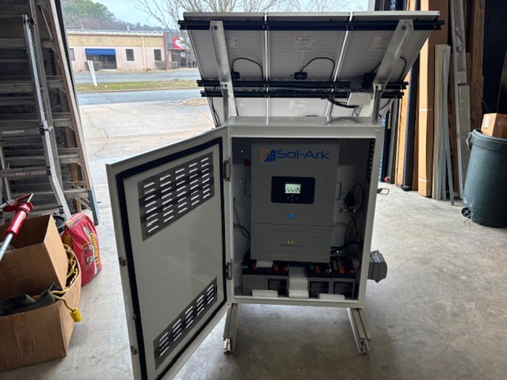 This Skid represents a portable power solution for charging battery powered tools on remote projects. We mounted it on a small trailer and the PV Array collapses for travel.