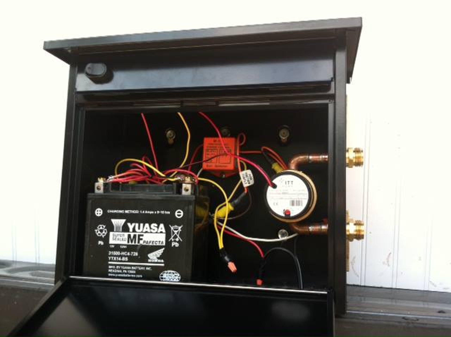 This mailbox was fitted with a small PV module, battery storage and a DC pump. It serves to cirrculate fluid supplying heat to a root zone heating application in a greenhouse.