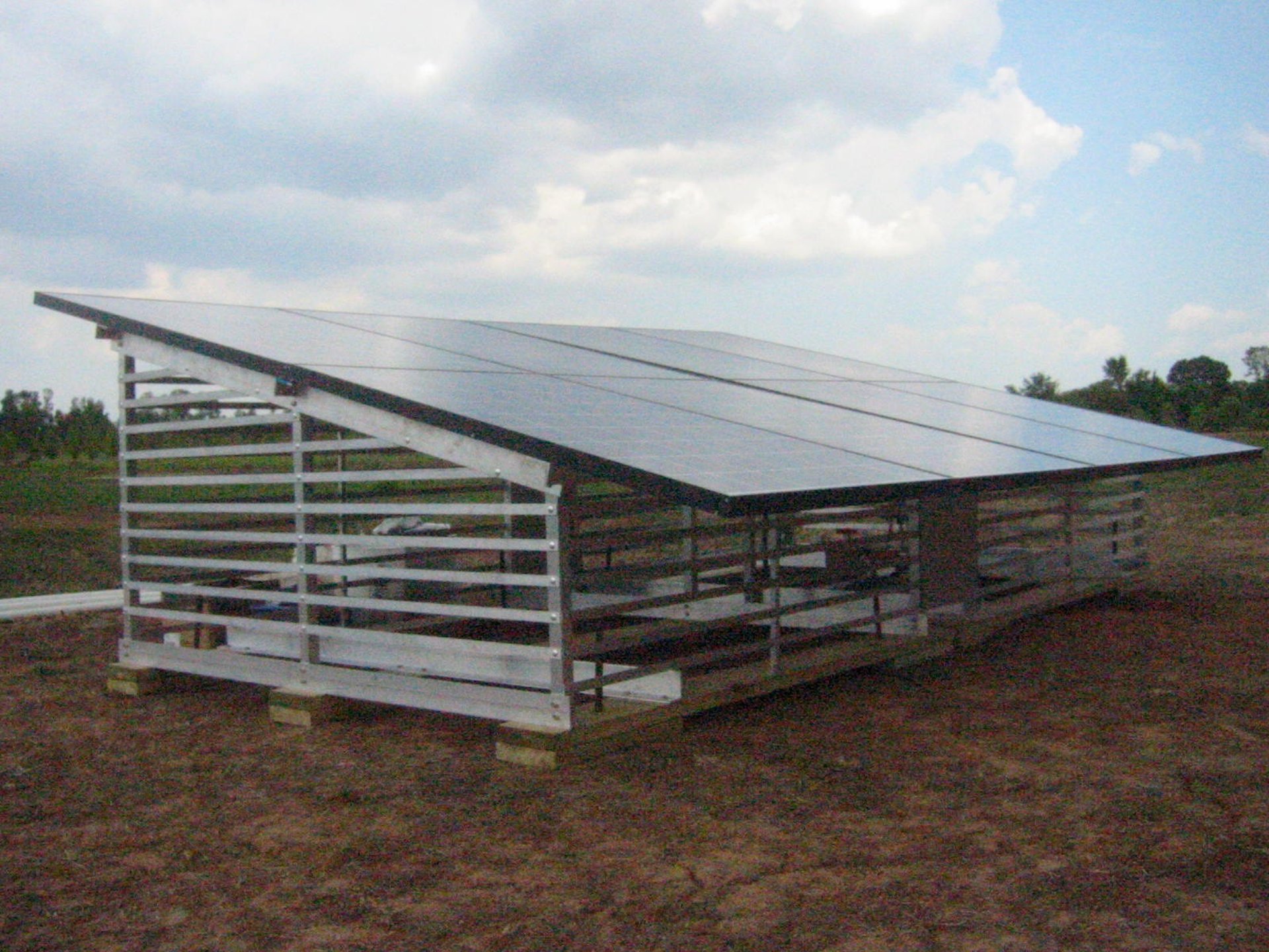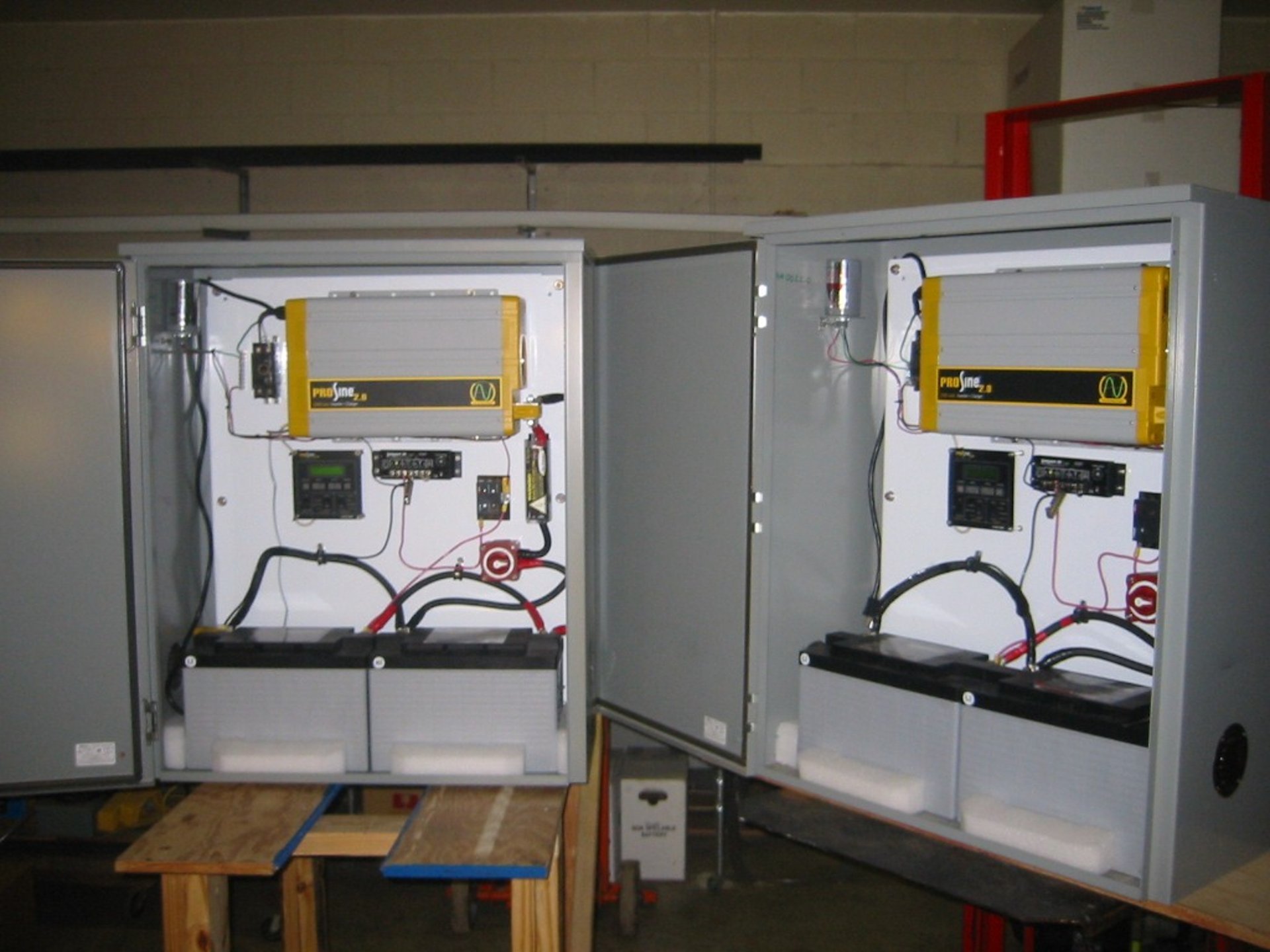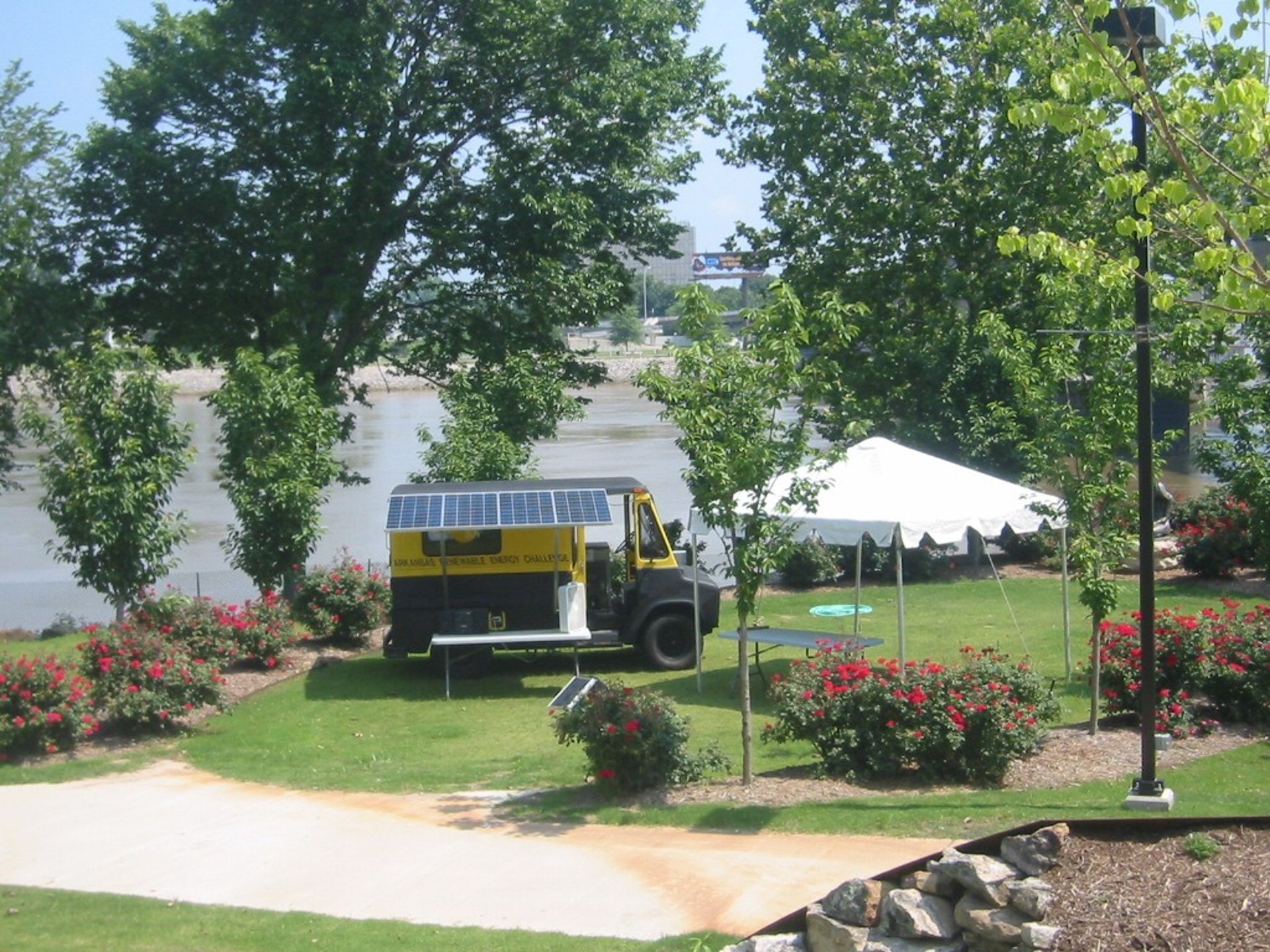 We built this portable power trailer in 2000. The 100w PV modules were recycled from the Meadowcreek project in Stone County and provided a 2kW array connected to 10kWh of sealed lead acid battery and a 24v 4kW Trace inverter. The array would fold in and down for travel. The trailer was also equiped with a powerful DC water pump capable of drawing water from a pond or other water source and discharging at the rate of 70gpm for aggricultural purposes. In 2005, after hurricane Katrena hit New Orlienes, we took the trailer down to the St Benard Port and it powered the temporary offices set up by the Port Authority to get the Port back up and running.